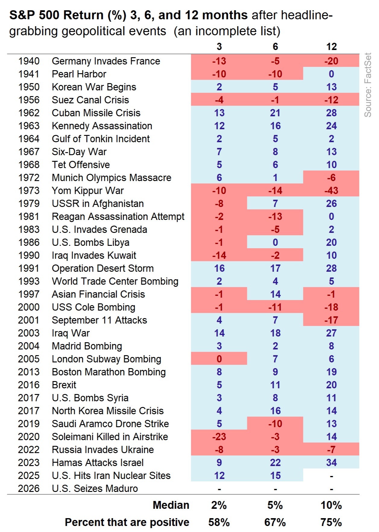 For decades, the correct investor response to major geopolitical events (even ones involving the U.S.) has been to ignore them. Because despite real-world stakes and media coverage, the U.S. stock market has tended to either look past these events or recover fairly quickly from any volatility. There are exceptions to every rule, but from the Cuban Missile Crisis to the Gulf War to today, stock markets have rarely been impaired long-term by even the most consequential events. That said, getting a handle on how impactful a geopolitical event might be to one’s portfolio involves two questions: 1) how will it impact corporate profits? 2) how will it impact the U.S. consumer? More often than not, the answers are “not enough to matter long-term.” Of course, that’s not always the case. U.S. support for Israel in the 1973 Yom Kippur War led to an OPEC oil embargo that sent gas prices soaring, straining consumers and corporations for years. And though the U.S. is far less reliant on foreign oil now than it was in the 1970s, a spike in energy prices is still the primary way that geopolitical shocks can impact the U.S. economy. Today, however, oil prices hover near post-Covid lows amidst an oversupplied market… with new Venezuelan oil potentially on the way. U.S. companies do very little business in Venezuela, and the conflict is far enough from U.S. soil that it hasn’t impacted consumer spending or sentiment much yet (relative to something like 9/11). We will monitor the situation from here.
