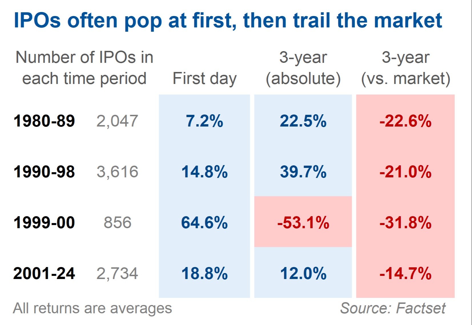 But what does history say? Is IPO hype warranted by performance? Typically, no. IPOs can lead to the occasional home run, but long-term returns have generally been poor. The average IPO (of nearly 10,000 IPOs since 1980) underperformed the market by over 20% in the first three years (measured from close of first trading day). Nearly 60% of these companies returned 0% or less over the three years that followed their IPOs.