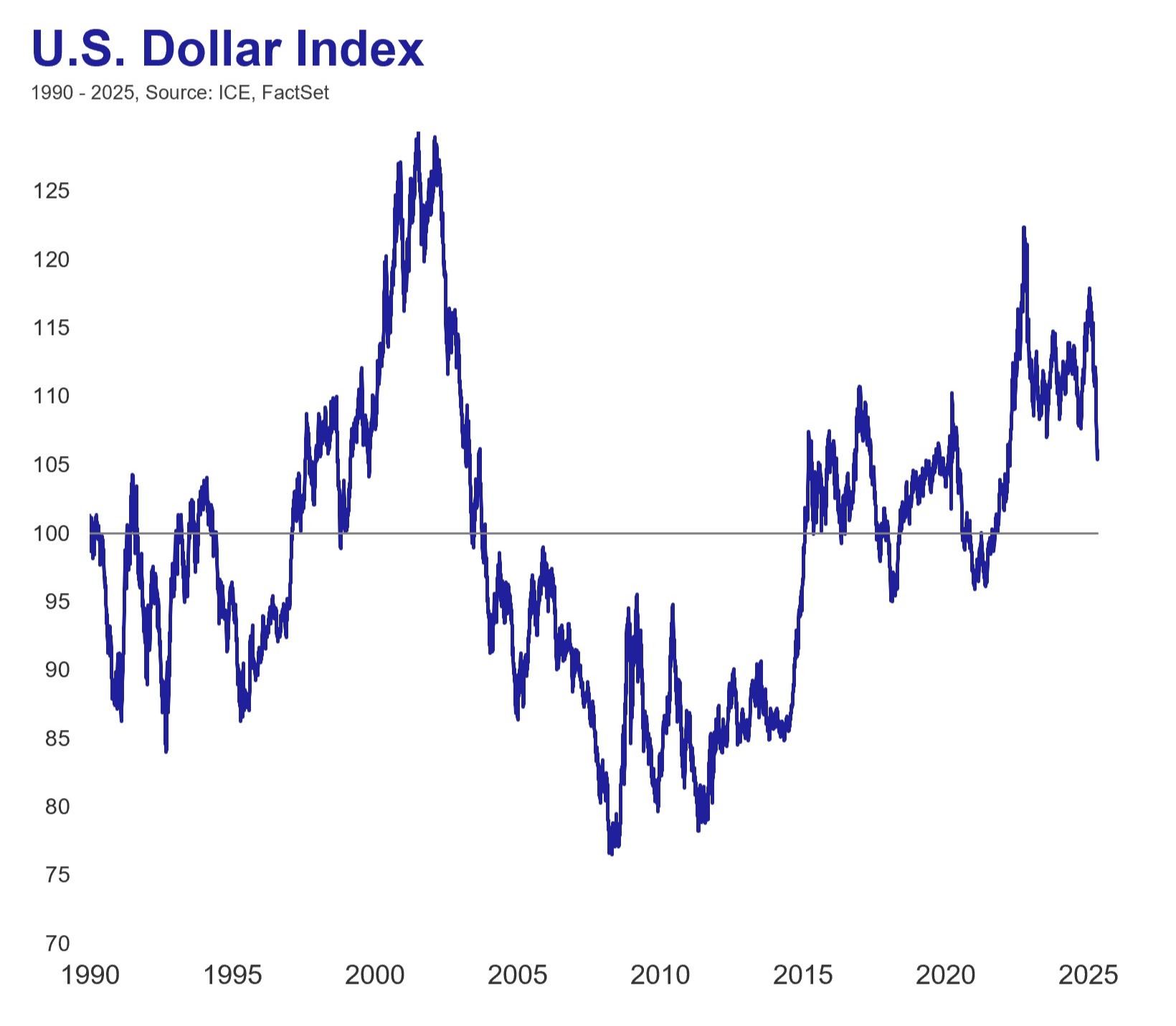 With the US dollar down 9% in 2025, concerns about its reserve currency status have again begun to burble. With the administration’s ongoing tariff enactment and dispute with the Federal Reserve, dollar weakness is perhaps unsurprising, especially after hitting a multi-year high in January. And while a slow diversification away from dollar dominance seems likely to continue – perhaps exacerbated by the current policy prescription and overall trend towards deglobalization ‒ it is my opinion that the lack of good alternatives (along with many of the things that America still does very well) will keep the dollar as the world’s dominant and reserve currency for the foreseeable future. Some quick-hitters below: