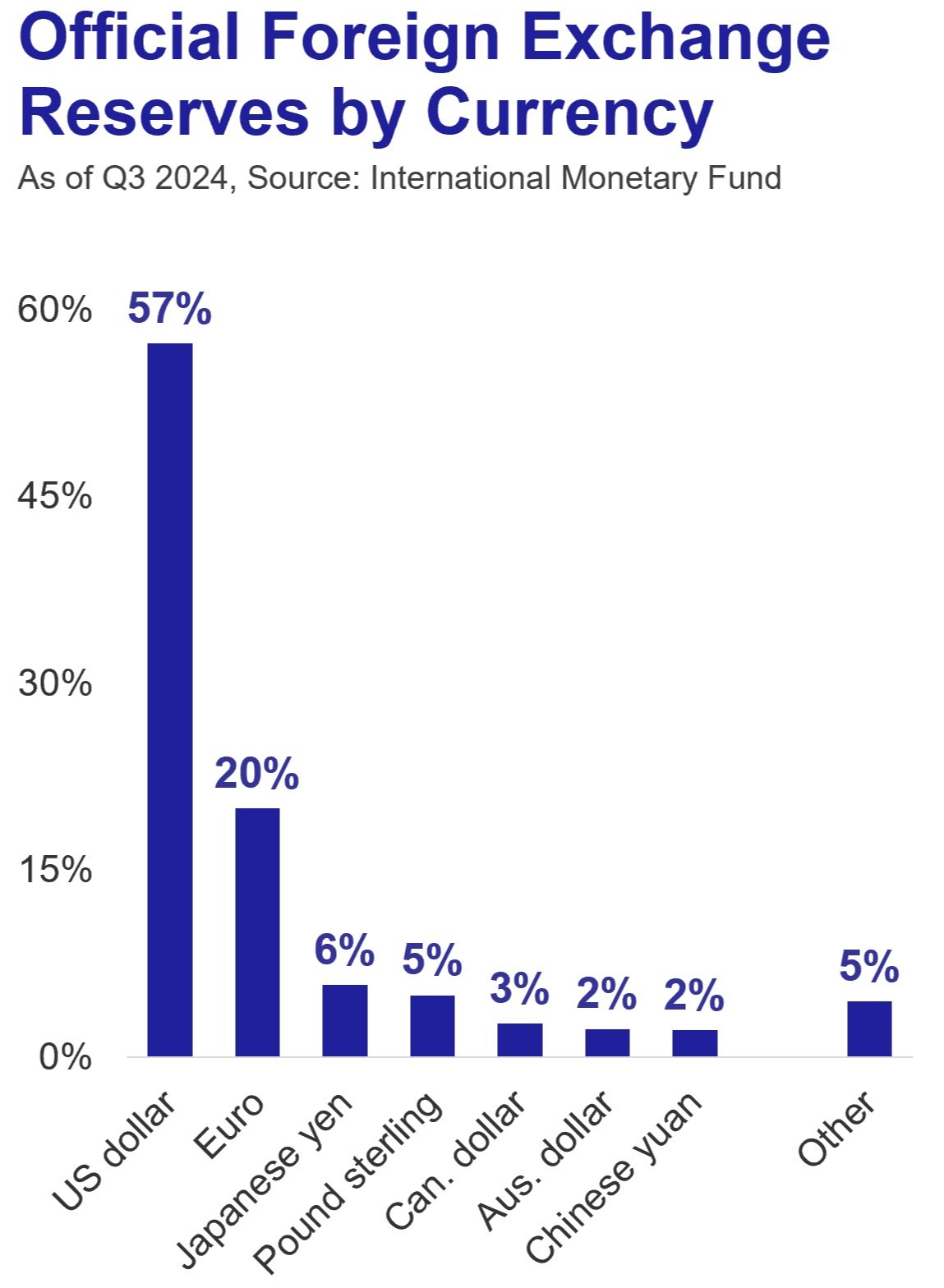 2. Importance of the economy in international trade. The US dollar represents 54% of global export invoicing, 57% of official foreign exchange reserves, and is used in 88% of foreign exchange transactions. These percentages may shrink somewhat in a more multi-polar, less globalized world, but network effects will make it difficult for countries to exit the dollar or even to materially reduce exposure. Global financial infrastructure has been designed over the last several decades explicitly for widespread U.S. dollar usage (e.g., petrodollars), which reduces uncertainty and cost across all layers of global finance. This is not written in law but would be hugely difficult to upend in an interconnected world.